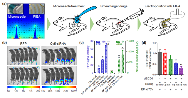 (a)微针滚轮及柔性插指电极实物图、电场模拟图,以及该电穿孔策略的操作步骤;(b)RFP、siRNA电穿孔后小鼠活体成像结果;(c)RFP、siRNA电穿孔后定量分析结果;(d)siRNA介导皮肤中靶基因的表达沉默。