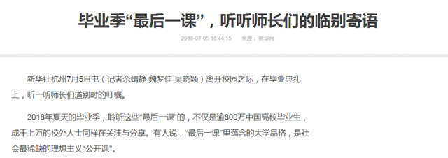 2018年夏天的毕业季,聆听这些“最后一课”的,不仅是逾800万中国高校毕业生,成千上万的校外人士同样在关注与分享。有人说,“最后一课”里蕴含的大学品格,是社会最稀缺的理想主义“公开课”。